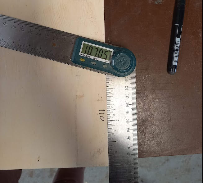 On recommence pour la face avant, nous avons un angle a 107°, il faut donc le couper à cet angle. Pour ce faire il faut régler l'angle de la lame de la scie sur 107-90 ==> 17° d'angle de lame.
