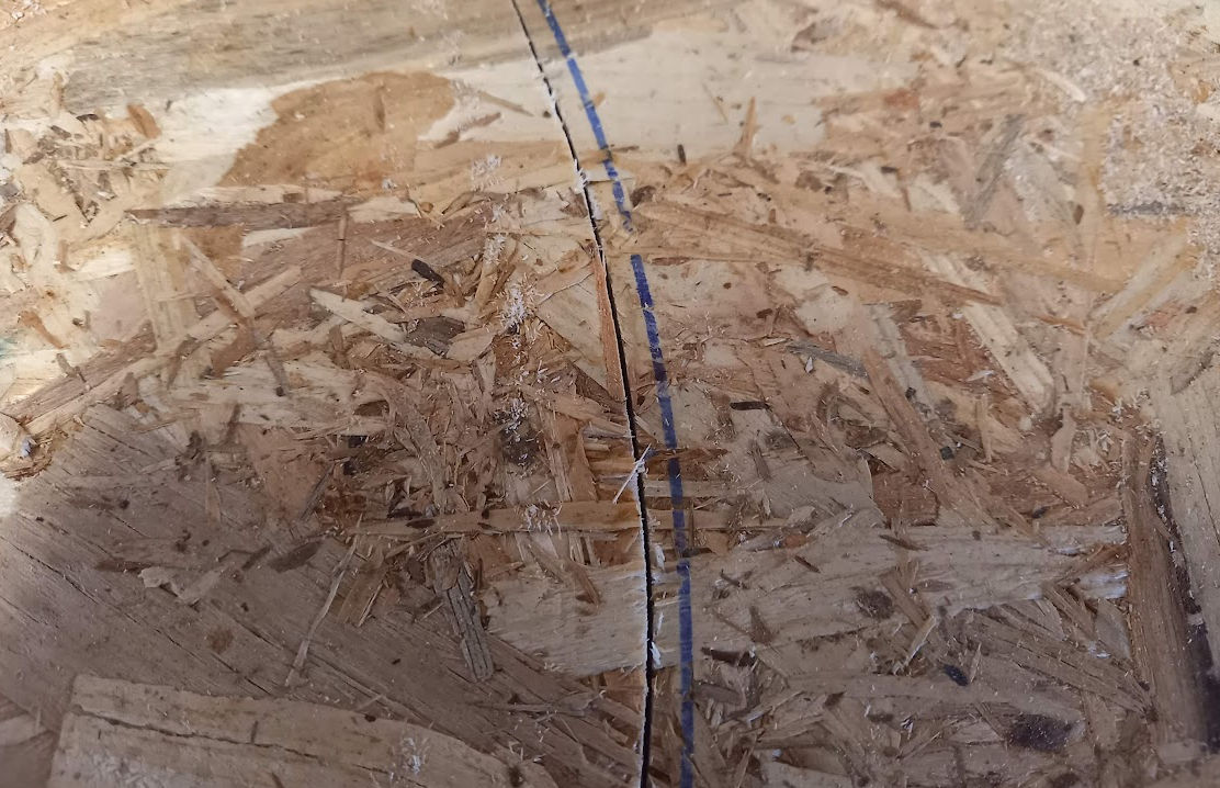 Attention les fraise droites HSS brasé ne font pas bon ménage avec l'OSB, elle se désaffute très rapidement. Si la coupe est difficile ou si des marques de brûlé apparaissent, changer de fraise car elle est désaffutée. Il faut utiliser dans l'OSB une fraise carbure.