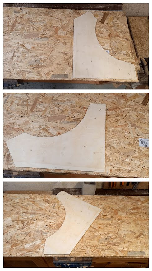 Avec le passage de la défonceuse et de la fraise a copier, on voit que la forme du gabarit à bien été reproduite dans l'OSB (à droite de l'image ci-dessous) et que j'avais bien coupé légèrement plus grand à la scie sauteuse (à gauche de l'image)
