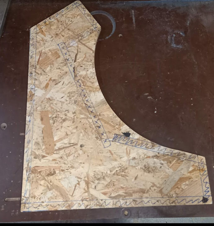 Tout d'abord sur ma planche d'OSB, je trace le contour du gabarit au feutre. Il n'y a pas besoin d'être très précis car nous allons couper autour avec une scie sauteuse.