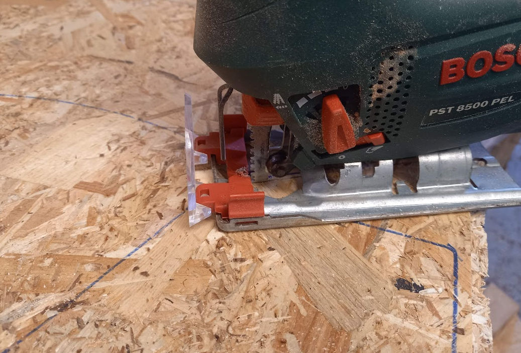 Tout d'abord sur ma planche d'OSB, je trace le contour du gabarit au feutre. Il n'y a pas besoin d'être très précis car nous allons couper autour avec une scie sauteuse.
