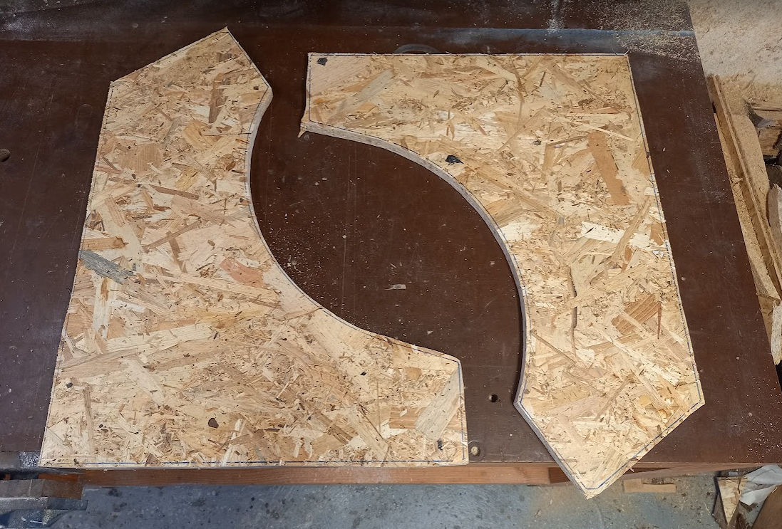 Avec le passage de la défonceuse et de la fraise a copier, on voit que la forme du gabarit à bien été reproduite dans l'OSB (à droite de l'image ci-dessous) et que j'avais bien coupé légèrement plus grand à la scie sauteuse (à gauche de l'image)