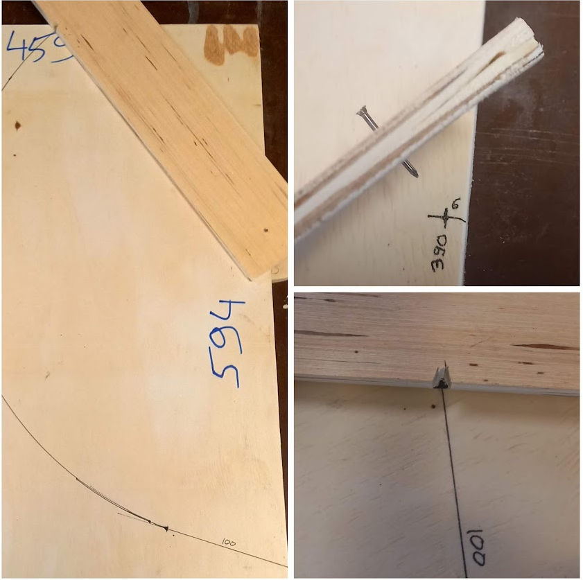 Ensuite viennent les étapes de découpe. Pour faire l'arc de cercle, nous utiliserons une défonceuse montée en "compas" sur une planche en bois. Le reste des découpes droites se font à la main et a la scie sous table.