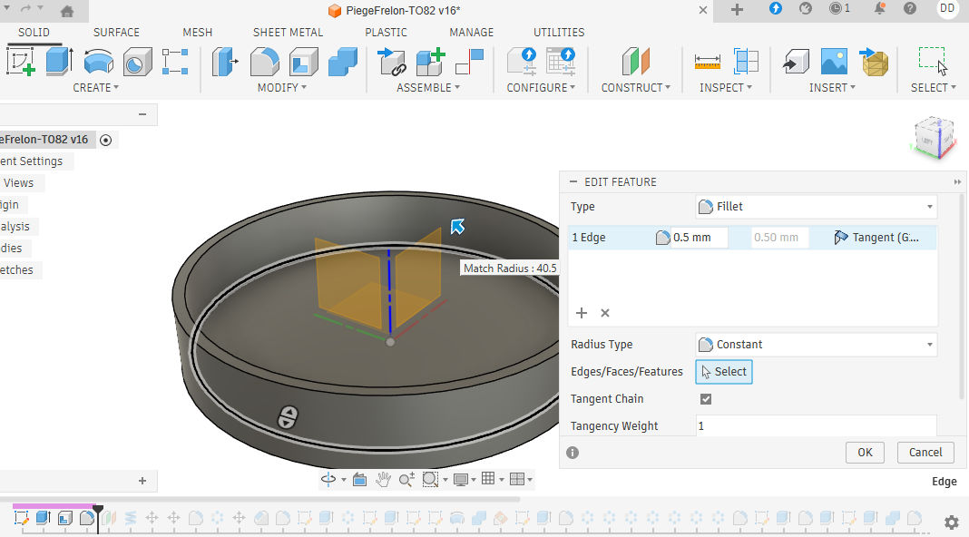 Afin d'éviter d'avoir des angles droits sur notre pièce, nous allons arrondir l'arrête intérieur de notre volume. Cela évite que la pièce ne se casse car les angles sont des points de fragilité.