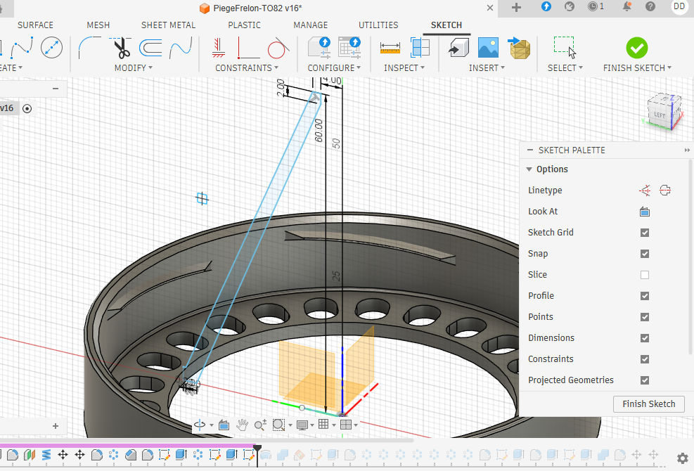 On a maintenant une belle grille qui n'a qu'un trou pour laisser rentrer les frelons en bout de grille avec une entrée de 8 mm lui permettant de rentrer. Sur cette grille nous avons une grande quantité de trous permettant aux insectes plus petits de s'échapper au besoin. J'ajoute maintenant au corps de la pièce deux "pieds" qui permettrons de poser le bocal en verre sur la tranche. Pour cela je créer une nouvelle esquisse sur le plan du bas, cela va nous permettre de dessine des cercles de 15 mm de diamètre, positionnés à 50 mm du centre de la pièce.