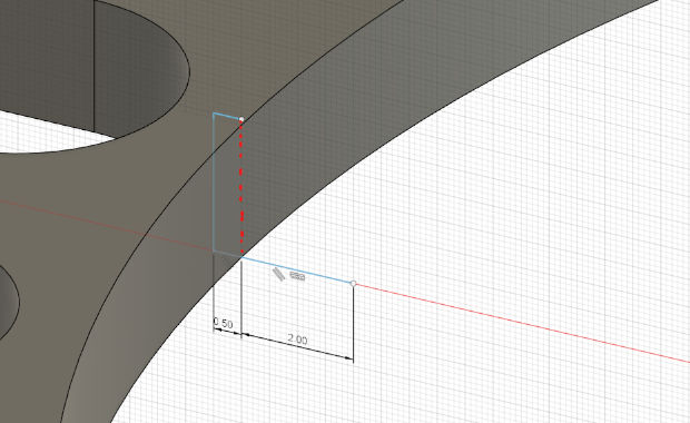 Ensuite à la base nous allons réaliser une forme similaire mais en "trichant" un peu. En effet nous devrions repartir de la face intérieur de notre trou dans le couvercle, mais cela peut poser des problèmes plus tard. Pour éviter cela, je rajoute un petit trait de 0,5 mm en "entrant dans" la matière. Cela nous permet de garantir que notre cône sera bien "soudé" avec le couvercle initial.