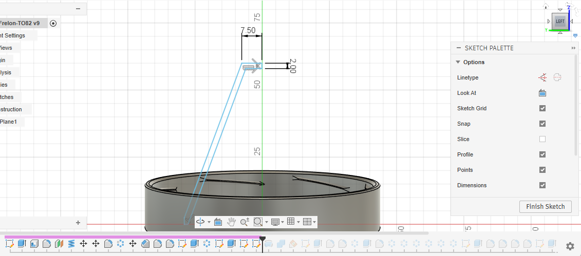 Pour percer le cône, un plan de construction incliné est crée en suivant l'esquisse précédente. Sur cette esquisse inclinée, on dessine les perçages qu'il y aura à faire dans le cone pour que d'autres petits insectes puissent sortir.