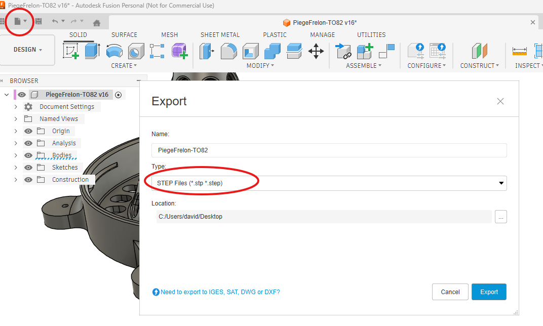 Pour l'envoyer vers l'imprimante il faut exporter cette pièce dans un format de "partage" qui est très standard pour les logiciels de 3D, le format STEP.