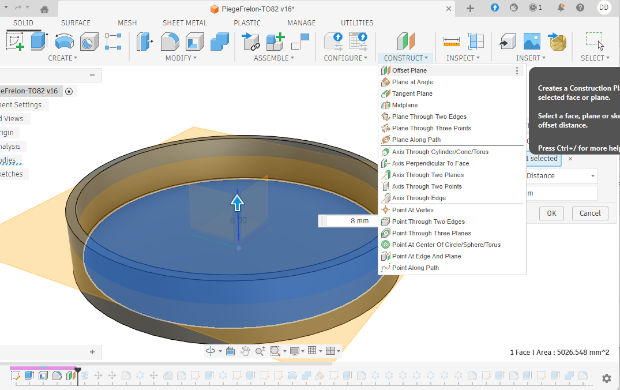 Arrive maintenant une étape importante, la réalisation de l'hélice. J'ai du faire 3 impressions pour arriver a avoir une hélice correcte et un bon serrage sur mon pot. On va commencer par créer un plan décalé, de 8 mm par rapport au fond de notre pièce.