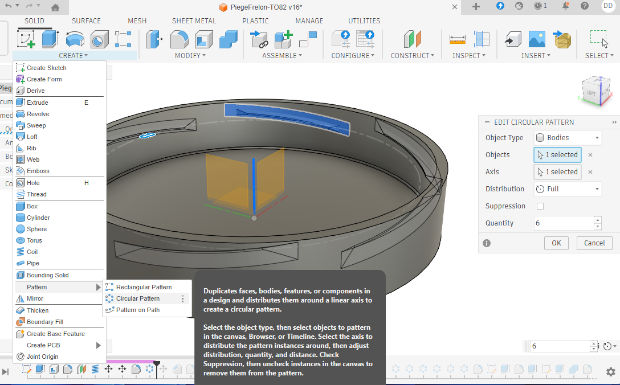 Puis il va falloir à nouveau utiliser l'outil Pattern ==> Circular Pattern pour reproduire ce trou sur notre couvercle. Dans mes essais je trouvais que 25 trous semblait un bon compromis. Là aussi on selectionne les faces de notre trou comme "Objet" à reproduire, puis l'axe bleu pour indiquer autour de quel axe la rotation et la reproduction vont se faire.