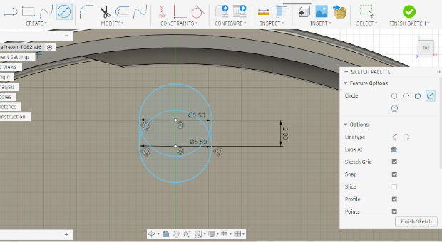 J'ajoute maintenant au corps de la pièce deux "pieds" qui permettrons de poser le bocal en verre sur la tranche. Pour cela je créer une nouvelle esquisse sur le plan du bas, cela va nous permettre de dessine des cercles de 15 mm de diamètre, positionnés à 50 mm du centre de la pièce.