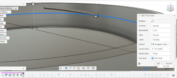 A partir de ce plan décalé nous allons créer une hélice. Cette hélice va devoir être précisément positionnée pour que le serrage soit efficace. Ici on utilise notre plan décalé comme surface de départ. Il faut ensuite préciser les paramètres de diamètre, de révolution et de pas (pitch) pour créer un tronçon d'hélice. La forme que j'ai testé qui fonctionne le mieux est d'utiliser une section triangulaire de 3mm.