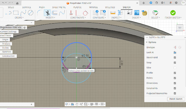 Puis je réalise sur la base de l'esquisse initiale du couvercle un arc de cercle, cet arc de cercle va servir pour la casquette.