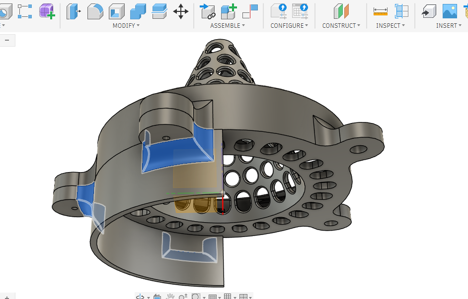 Puis il va falloir à nouveau utiliser l'outil Pattern ==> Circular Pattern pour reproduire ce trou sur notre couvercle. Dans mes essais je trouvais que 25 trous semblait un bon compromis. Là aussi on selectionne les faces de notre trou comme "Objet" à reproduire, puis l'axe bleu pour indiquer autour de quel axe la rotation et la reproduction vont se faire.