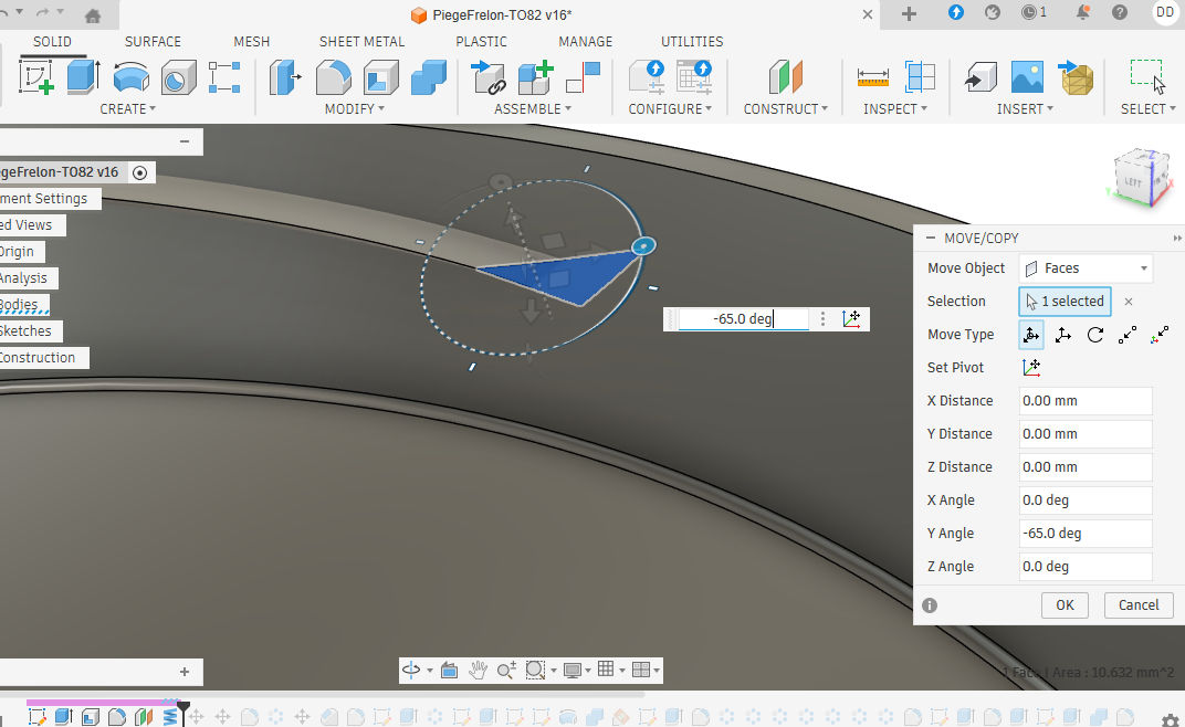 L'outil "Move/Copy" permet de modifier /déplacer une face. Nous allons ici l'utiliser pour donner un angle sur la sortie de notre pas d'hélice. Pour cela utiliser dans le menu "Modifier" l'outil "Move/Copy". Ensuite sélectionner la face a déplacer, puis utiliser les poignées pour modifier l'angle de la face.