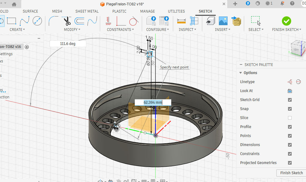 On viens ensuite créer les trous de sortie de 5,5mm sur le pourtour. Ces trous permettent aux insectes qui seraient rentrés, mais que l'on ne veut pas piéger, de ressortir. Pour cela nous allons créer une esquisse sur la face interne, le long de l'axe vert.