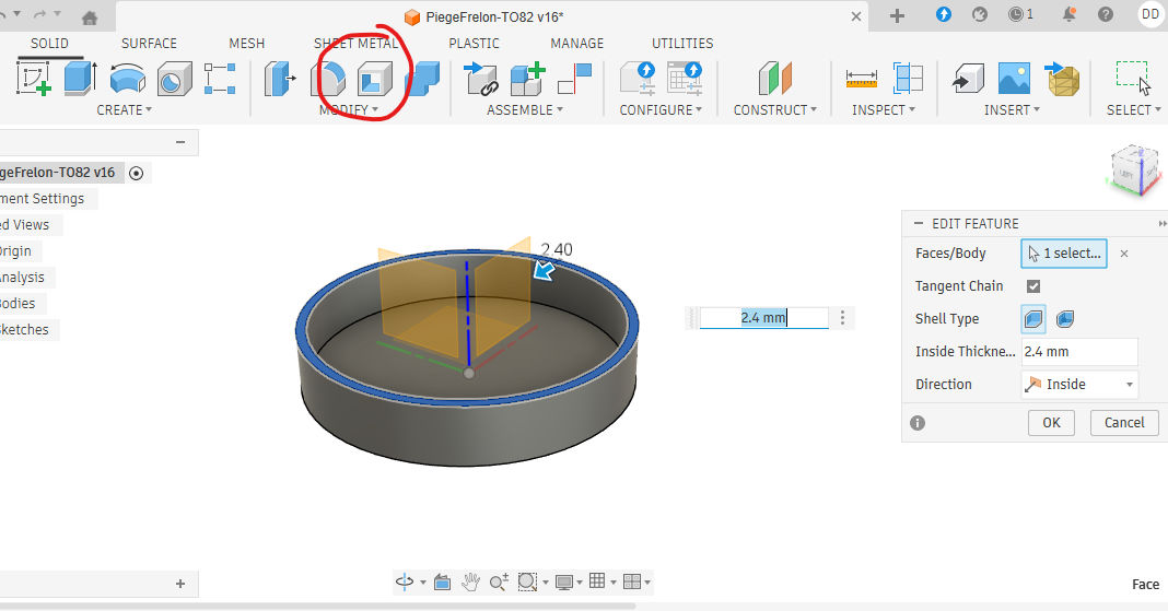 Pour faciliter l'entrée du couvercle sur le pot, nous allons réaliser un chanfrein sur l'arrête interne du couvercle. Ici on clique sur selectionne Modify ==> Chamfer , puis on selectionne l'arrête en cliquant dessus. Le paramètre utilisé est ici 1 mm pour qu'un chanfrein soit réalisé avec 1 mm de profondeur.