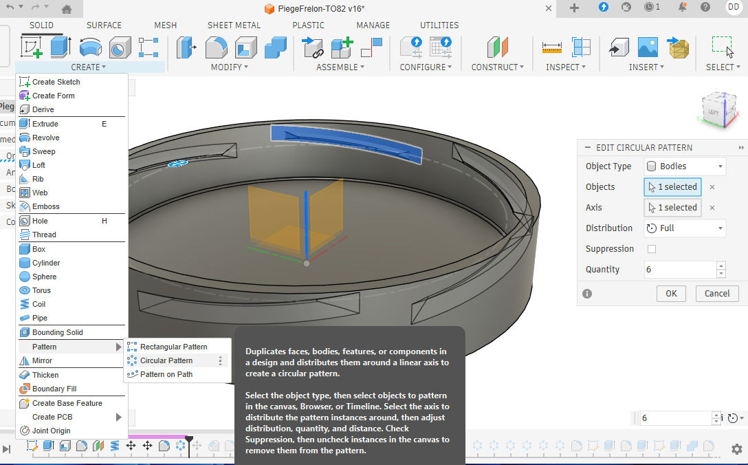 Puis il va falloir à nouveau utiliser l'outil Pattern ==> Circular Pattern pour reproduire ce trou sur notre couvercle. Dans mes essais je trouvais que 25 trous semblait un bon compromis. Là aussi on selectionne les faces de notre trou comme "Objet" à reproduire, puis l'axe bleu pour indiquer autour de quel axe la rotation et la reproduction vont se faire.