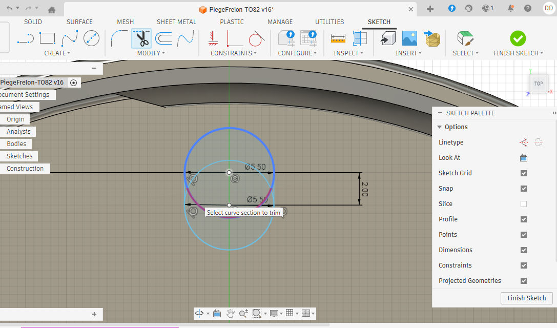 Cette esquisse sera composée de deux cercles de 5,50 mm de diamètres, puis de deux lignes pour les relier afin d'esquisser un trou oblong.