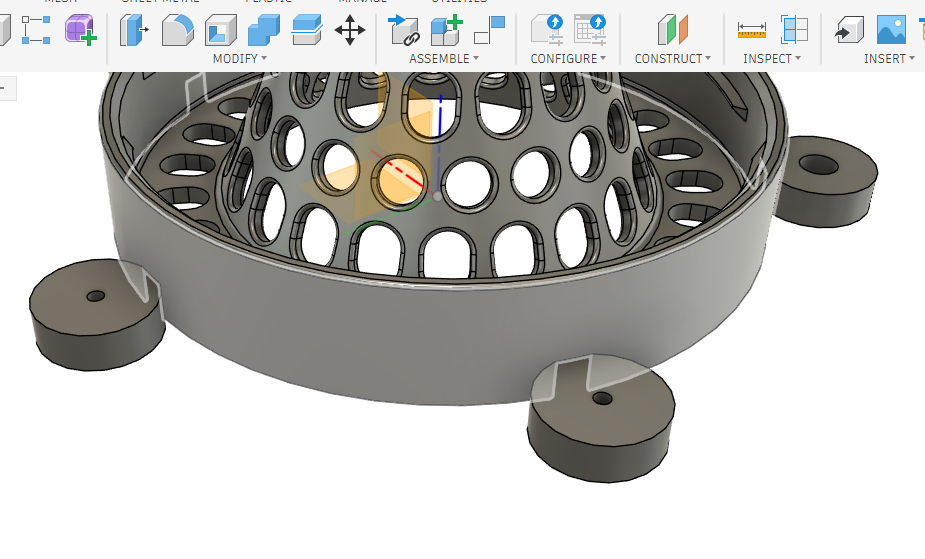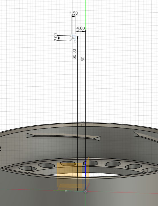 On viens ensuite créer les trous de sortie de 5,5mm sur le pourtour. Ces trous permettent aux insectes qui seraient rentrés, mais que l'on ne veut pas piéger, de ressortir. Pour cela nous allons créer une esquisse sur la face interne, le long de l'axe vert.
