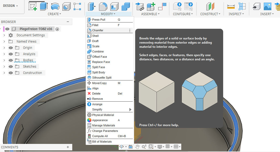 Pour faciliter l'entrée du couvercle sur le pot, nous allons réaliser un chanfrein sur l'arrête interne du couvercle. Ici on clique sur selectionne Modify ==> Chamfer , puis on selectionne l'arrête en cliquant dessus. Le paramètre utilisé est ici 1 mm pour qu'un chanfrein soit réalisé avec 1 mm de profondeur.