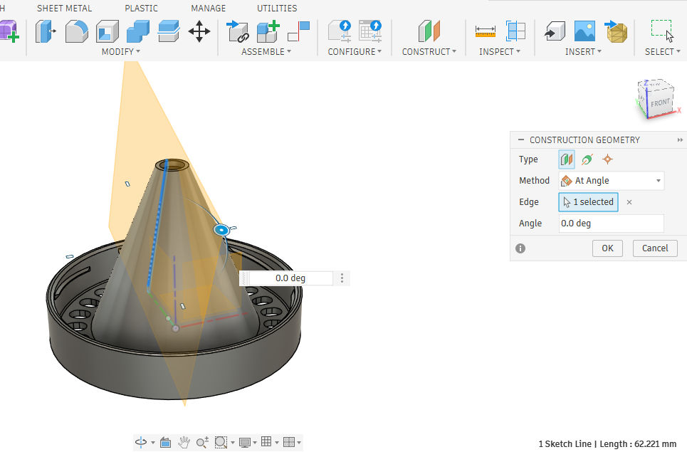 Maintenant on peu sélectionner l'arrête extérieure de notre esquisse pour la construction du plan. On le voit ainsi se matérialiser par une face orange à l'angle de notre cône.