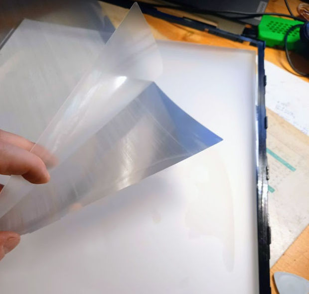 - En haut en blanc, le diffuseur, le polarisant arrière et les tubes néon pour le rétroéclairage.