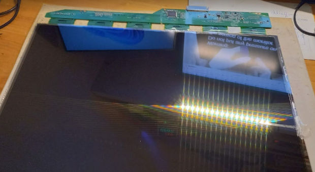 En retirant le cadre avant en acier, on récupère la dalle LCD. Attention les couches de verre contenant les cristaux liquides sont collés. Sur cet écran la partie en verre est tombée toute seule car les autocollants ne tenaient plus bien.