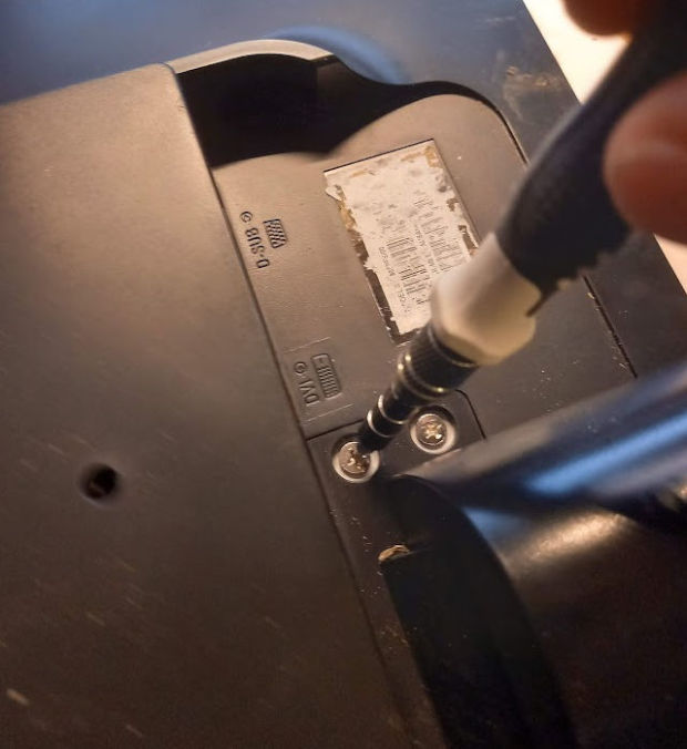 L'arrière de l'écran à subi un gros impact qui à cassé la coque en plastique mais aussi déformé la tôle protégeant la carte d'alimentations et la carte vidéo. Attention car sous ce chapeau il y a une alimentation qui sert à générer de la haute tension pour le rétro-éclairage (les 4 connecteurs à droite protégés par du scotch).