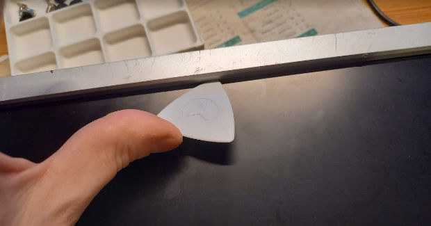 Il faut retirer le cadre plastique afin d'accéder aux couches suivantes. Attention, les couches ont un sens, ne pas inverser l'ordre des couches, ni les retourner, ni mettre la face avant derrière. Il y a des détrompeurs, mais le mieux reste de bien garder les couches dans le bon sens et le bon ordre lors du démontage.