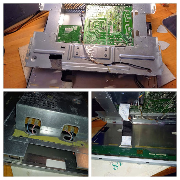 On attaque maintenant le démontage de la dalle. Attention à ne pas endommager l'isolant des câbles d'alimentation du rétro éclairage et bien retirer tous les scotchs et les clips. La carte électronique est maintenue par 3 vis, mais attention à ne pas décoller les rubans reliés au panneau LCD. A partir de maintenant il faut être méticuleux et propre.
