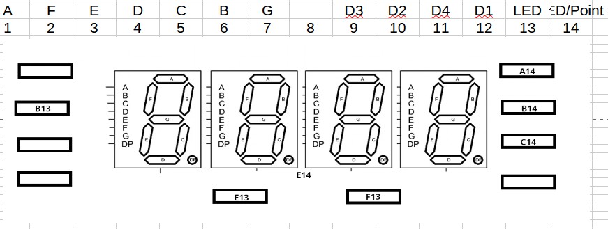 Voici le pinout de mon afficheur, certaines LED n'ont pas pu être testées car je n'ai pas trouvé comment les allumer, mais cela pose peu de problèmes car ce qui m'importe c'est d'afficher l'heure et la température.