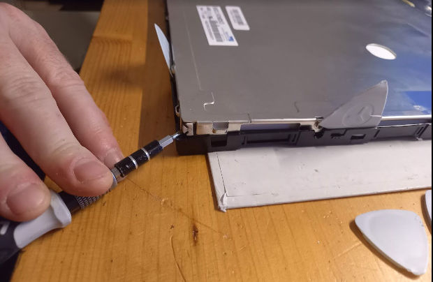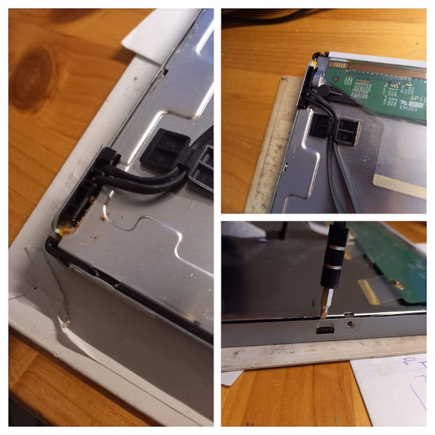 On attaque maintenant le démontage de la dalle. Attention à ne pas endommager l'isolant des câbles d'alimentation du rétro éclairage et bien retirer tous les scotchs et les clips. La carte électronique est maintenue par 3 vis, mais attention à ne pas décoller les rubans reliés au panneau LCD. A partir de maintenant il faut être méticuleux et propre.
