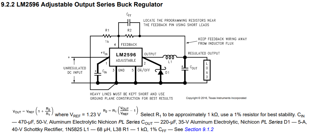 Une idée tentante est de refaire un circuit simple avec des convertisseurs DCDC accessibles pour remplacer le circuit original. Si on part sur une base à régulateurs LM2596HVS ADJ qui sont de petits DCDC variables, voilà le schéma de référence de la datasheet de ce composant :